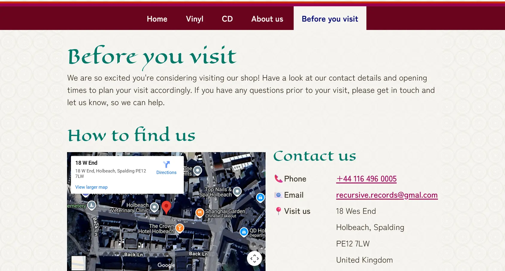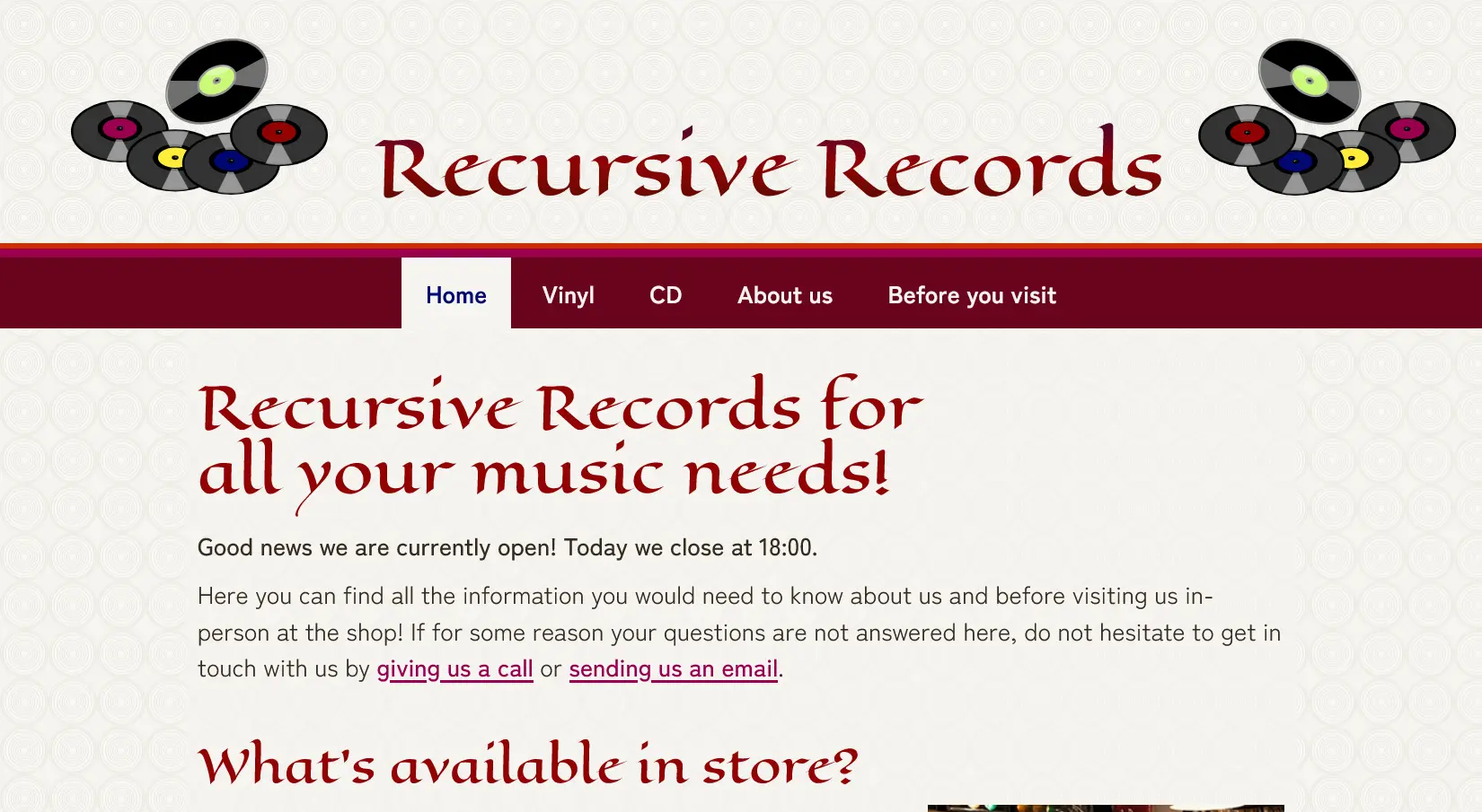 University project about a non e-commerce website for a fictitious small and independent retail shop based in a town somewhere in England - Recursive Records. The website had to contain all necessary and relevant information a customer would need to understand what the business offers, how to visit it in person and act as a promotion tool for attracting more people.
